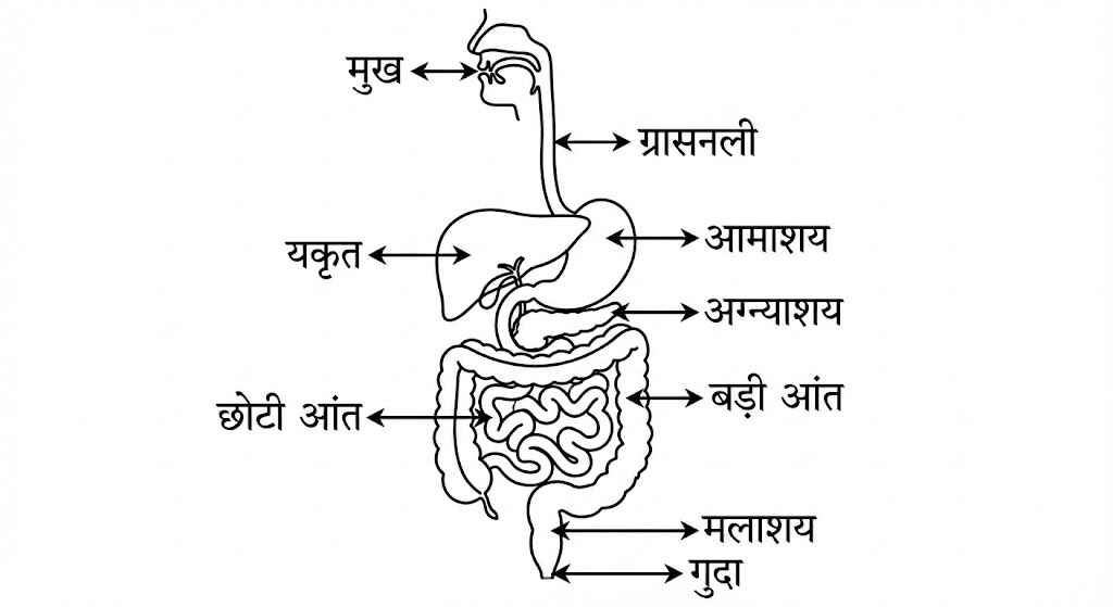 (चित्र में मुख, ग्रासनली, आमाशय, छोटी आंत, बड़ी आंत, यकृत और अग्न्याशय को नामांकित करें).